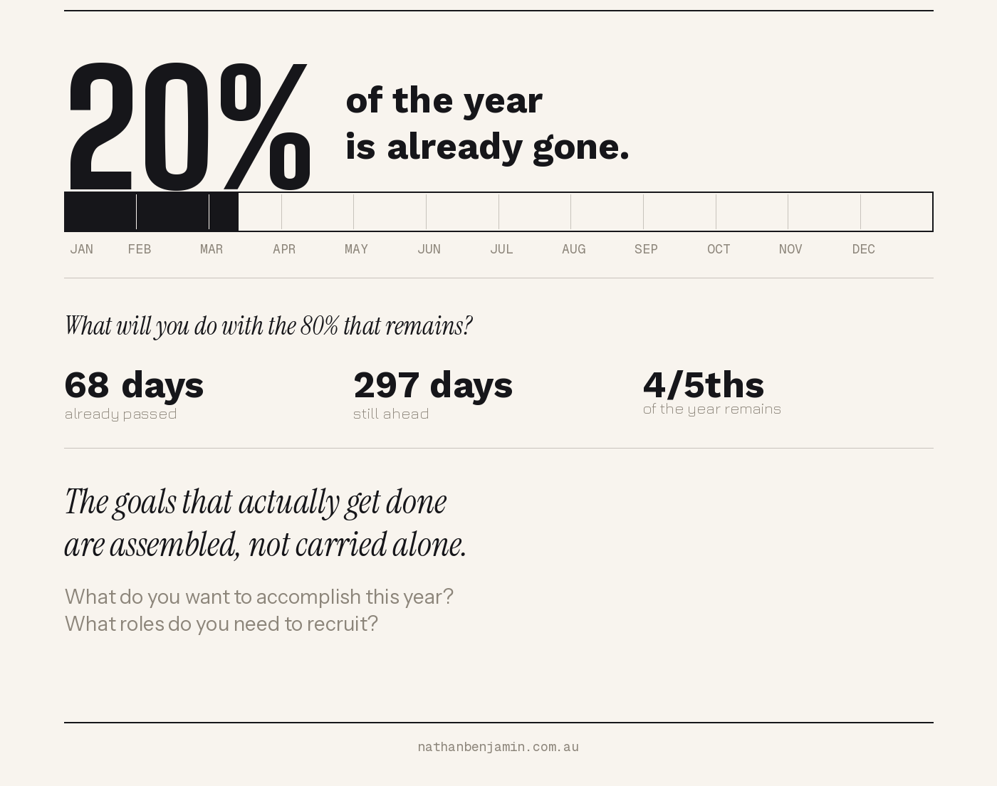 When we talk about goals. We treat them like private matters. Personal projects. Things we will get around to when the timing is right, when we have more capacity, when life settles down. But life does not settle down. And 20% of the year has already passed like a lightning strike.